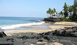 In the Hawaiian language, la'a loa means "very sacred".[2] Several Archaeological sites are in the area.[3] The ruins of haukalua Heiau (an Ancient Hawaiian temple) are on a point just south of the beach, at the parking lot which was added in 2000.[4] The stone structure was cleared and restored and a small ceremonial platform (lele) constructed by descendants of the people who lived in this area for hundreds of years.[5] A small rocky cove south of the point is popular for scuba diving in calm conditions.