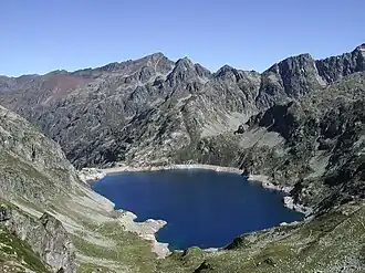 Lac d'Artouste is a lake in Pyrénées-Atlantiques, France in the region of Nouvelle-Aquitaine. At an elevation of 1997 m, its surface area is 0.56 km2.