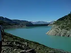 Lac de Cleuson is a reservoir in the municipality of Nendaz, Valais, Switzerland. Its surface area is 0.51 km2 (0.20 sq mi). Water from the reservoir is often pumped into the Grande Dixence Dam's reservoir, Lac des Dix, for use in hydroelectricity production.
