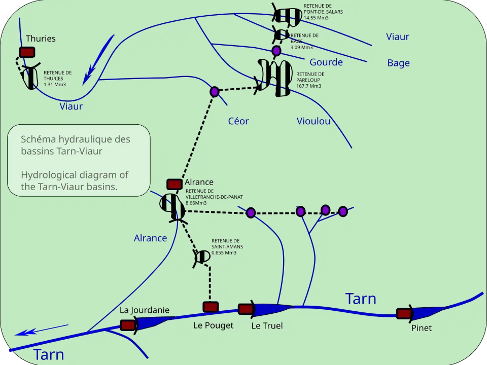 | Primary inflows | Vioulou, pumping station at Bage- taking water from the Viaur and the Bage |