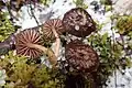 Laccaria typically have thick, widely spaced, purple to flesh-colored gills that are adnate to slightly decurrent in attachment. The spores are white and ornamented in most species.[5]