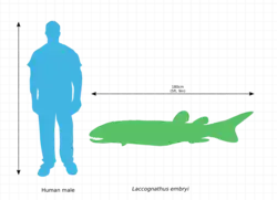 L. embryi is estimated to have been 1.8 m (6 ft) long with a wide flattened body.[5] Though only two partial specimens of the postcranial body have been recovered, L. embryi are believed to have the same body form as other species of Laccognathus.[2] L. grossi, for example, had wide and relatively short pectoral and pelvic fins arising from fleshy lobes. The caudal (tail) fin was heterocercal, with a long low upper (epichordal) blade and a rounded lower (hypochordal) blade three times as wide as the upper blade. The dorsal and anal fins were positioned close to the caudal fin.[6] The body was also covered in broadly overlapping thick scales, each roughly 2.5 cm (1 in) in diameter and ornamented at the exposed ends with small radially arranged tubercles, ridges, or both.[2]