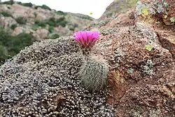 E. reichenbachii var. albertii (commonly called the Black Lace cactus) is a federally listed endangered species of the United States that is endemic to Texas.[10] It has been listed as endangered since 1979. Populations of E. reichenbachii var. albertii are found near the Kleberg, Jim Wells, and Refugio counties of south Texas.[11] Destruction of habitat, over-collecting, and livestock grazing have all contributed to its endangered status.[12]