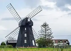 Dated to 1650 by leading authority Stanley Freese, Lacey Green windmill is the oldest surviving smock mill in England[9] and was restored in the 1970s, from a state of almost total collapse, by volunteers under the auspices of the Chiltern Society. The octagonal structure has a brick base carrying a weatherboarded timber frame; the sails are modern but the machinery is largely original. The windmill was designated as Grade II* listed in 1985.[10]