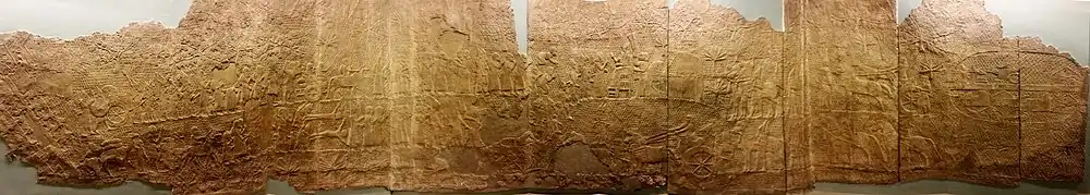 The Lachish reliefs are a set of Assyrian palace reliefs narrating the story of the Assyrian victory over the kingdom of Judah during the siege of Lachish in 701 BCE. Carved between 700 and 681 BCE, as a decoration of the South-West Palace of Sennacherib in Nineveh (in modern Iraq), the relief is today in the British Museum in London,[3] and was included as item 21 in the BBC Radio 4 series A History of the World in 100 Objects by the museum's former director Neil MacGregor. The palace room, where the relief was discovered in 1845–1847, was fully covered with the "Lachish relief" and was 12 metres (39 ft) wide and 5.10 metres (16.7 ft) long.[4] The Lion Hunt of Ashurbanipal sequence was found in the same palace.