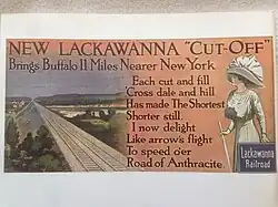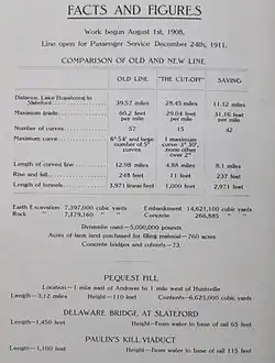 When it opened on December 24, 1911, the Cut-Off was considered a super-railroad, a state-of-the-art rail line, having been built using large cuts and fills and two large concrete viaducts, allowing what was considered high-speed travel at that time. It was 11 miles (18 km) shorter than the Lackawanna Old Road, the rail line it superseded; it had a much gentler ruling gradient (0.55% vs. 1.1%); and it had 42 fewer curves, with all but one of those remaining permitting passenger train speeds of 70 mph (110 km/h) or more.[2] It also had no railroad crossings at the time of its construction. All but one of the line's 73 structures were built of reinforced concrete, a pioneering use of the material.[3] The construction of the roadbed required the movement of millions of tons of fill material using techniques similar to those used on the Panama Canal.[4]