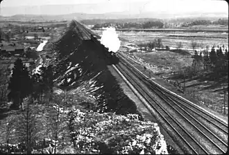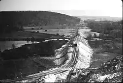 The Pequest Fill extended west of Andover to Huntsville, New Jersey. It was at its maximum height 110 feet (34 m) tall and was 3.12 miles (5.0 km) long, requiring 6,625,648 cubic yards (5,065,671 m3) of fill.[2] Armstrong Cut was 100 feet (30 m) deep and 1 mile (1.6 km) long, mostly through solid rock. The line's deepest cut was Colby Cut (immediately west of what would become Roseville Tunnel) at 130 feet (40 m) deep. The tunnel was not in the original plans for the Cut-Off, and in fact much of the cut above the tunnel had already been blasted when in October 1909 unstable anticline rock was encountered,[13] leading to a decision to abandon the cut and to blast what would become a 1,040-foot (320 m) tunnel instead.[14] Contractor David W. Flickwir, whose section included Roseville Tunnel and the eastern half of the Pequest Fill, worked around the clock during the summer of 1911 when construction fell behind schedule.[4]