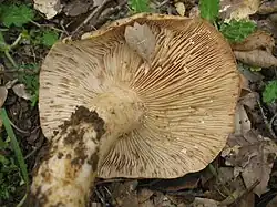Lactarius trivialis is a European species that is similar in appearance to L. argillaceifolius, and they are often confused for each other.[10] L. trivialis can be distinguished by gills that stain brown when exposed to the latex, and a preference for growing in conifer- and birch-rich boreal and subalpine forests.[11] Variety megacarpus may be confused with L. pallescens, a smaller paler-colored species with latex that stains gills lilac rather than brown.[12]