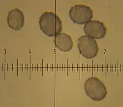 The spores are roughly spherical to broadly elliptical, and measure 7–11 by 7–8 μm. They are ornamented with warts and ridges that sometimes form a partial reticulum (a pattern of interconnected ridges), with prominences up to 1 μm high. The spore are hyaline (translucent) and amyloid, meaning that they will absorb iodine when stained with Melzer's reagent. The cap cuticle of young specimens is made of a tissue type known an ixotrichoderm, which contains gelatinized hyphae of different lengths arranged in roughly parallel fashion. As the mushroom matures, the cap cuticle gradually becomes an ixolattice—characterized by branching, entangled, gelatinous hyphae.[5] The basidia (the spore-bearing cells) are four-spored, and measure 45–52 by 9–10.5 μm. The pleurocystidia (cystidia on the gill face) are abundant, and relatively long—between 60 and 140 μm long by 6–14 μm thick. The cheilocystidia (cystidia on the gill edge) measure 32–67 by 6–9 μm.[1]