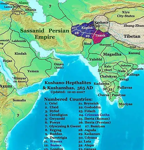 Rock carvings found in many parts of Ladakh indicate that the area has been inhabited from Neolithic times.[30] Ladakh's earliest inhabitants consisted of nomads known as Kampa.[31] Later settlements were established by Mons from Kullu and Brokpas who originated from Gilgit.[31] Around the 1st century, Ladakh was a part of the Kushan Empire. Buddhism spread into western Ladakh from Kashmir in the 2nd century. The 7th-century Buddhist traveller Xuanzang describes the region in his accounts.[32] Xuanzang's term of Ladakh is Mo-lo-so, which has been reconstructed by academics as *Malasa, *Marāsa, or *Mrāsa, which is believed to have been the original name of the region.[33][34]