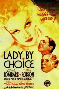 Lady by Choice is a 1934 American romantic drama film released by Columbia Pictures starring Carole Lombard as a fan dancer and May Robson as a homeless drunk asked to pose as the dancer's mother for a publicity stunt, with unexpected consequences. Promoted as a follow-up to Frank Capra's 1933 hit Lady for a Day (1933), it resembles the earlier film only in the casting of Robson.