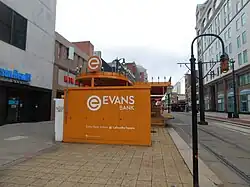 Lafayette Square (officially Evans Bank @ Lafayette Square since November 8, 2019, for sponsorship purposes) is a Buffalo Metro Rail station near City Hall and is near the center of the Buffalo Central Business District at Lafayette Square located in the 400 block of Main Street (between Lafayette Square and Mohawk Streets) in the Free Fare Zone, which allows passengers free travel between Canalside station and Fountain Plaza station. Passengers continuing northbound past Fountain Plaza are required to have proof-of-payment. Lafayette Square station is the closest to the Buffalo & Erie County Public Library, located one block east at Washington and Clinton Streets. On February 28, 2019, The Buffalo News announced that Evans Bank, which opened its downtown headquarters in the Main-Court Building the previous October, bought the naming rights to the station for nearly $161,000 for five years and nearly $352,000 if extended to 10 years.[3]