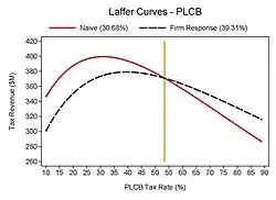 The Laffer curve has also been extended to taxation of goods and services. In their 2018 Econometrica paper, Miravete, Seim, and Thurk, show that in non-competitive markets, the strategic pricing response of firms is important to consider when estimating the Laffer curve.[31] The authors show that firms increase their prices in response to a decrease in the ad valorem tax, leading to less of a quantity increase than would otherwise be expected. The net effect is to flatten the Laffer curve and move the revenue maximum point to the right.