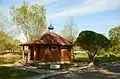 The church is built of stone. It has the shape of a rectangle with an open dome and bell tower in the middle of the gable.