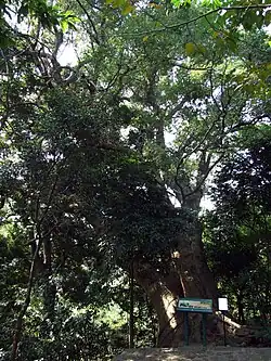 The Hollow Tree is an Autumn Maple (Bischofia javanica) estimated at to about one hundred years old. It reaches a 17-metre high and 1.9-metre in diameter.[20] It is called "hollow tree" because it has a huge hole inside the tree. The hole has openings in both upper and lower section of the tree. It is once said that there was a honeycomb and villagers tried to fire the comb but finally fired the tree altogether. However, the explanations from the description board of the tree told another cause. The parenchyma cells in the centre of the trunk contracted and withered as a result of infection. Small holes began to appear inside the tree. However, the nutrients and moisture transporting cells around the exterior part of the trunk continued to grow and thicken. The trunk later get thicker, and the centre hollow expanded in tandem.