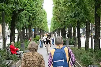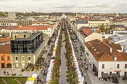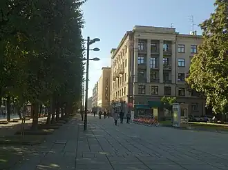 Laisvės Alėja[1] stretches between the St. Michael the Archangel's Byzantine-style church to the Central Post Office and Tadas Ivanauskas Zoological Museum, around the Kaunas Old Town, the oldest section of Kaunas. Stretching for 1.6 kilometres (1 mi), Laisvės Alėja is the longest pedestrian street in Eastern Europe.[2] Motor vehicles cannot travel along Laisvės Alėja, but can cross it at intersections with other streets where motor traffic is permitted. The boulevard is separated into two walkways by a median strip lined with linden trees.
