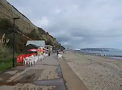 Lake is a seaside village situated above the cliffs on Sandown bay, it stands at an elevation of 63 feet (19 m) above sea-level.[5] Lake's beach or 'Welcome Beach' has golden sands and reached by a steep path down the sandstone cliffs to the Revetment.[6] It has two cafes (Hinks and Strollers), beach huts, a Sea Scout hut and inshore lifeboat.