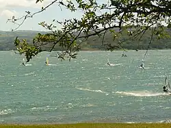 From November through April the strong, dependable winds attract windsurfers and kite surfers to its western end.[4] Many consider Lake Arenal one of the world's foremost windsurfing and kite surfing areas. Wakeboarding is gaining popularity in Costa Rica, with Lake Arenal being the center of this activity. Stand up paddling[5] and kayaking are also popular activities for tourists visiting the lake's eastern part near the earthen dam. There is plenty of good fishing (primarily for rainbow bass) and now kayak fishing opportunities in the shallow and secluded coves. The area surrounding the lake has good hiking, biking, bird watching, and horseback riding opportunities.[6]