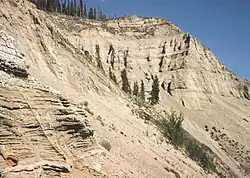 Diamicton, glacial, glaciolacustrine, and lacustrine origin deposits exist in many areas of the Copper River Basin.[9][22] All major rivers present today occupy narrow valleys that have cut up to 137 m (449 ft) into the bottom of the basin.[12] Lacustrine sediments of the lake are visible in many river bluffs throughout the basin.[10] Several extant lakes in the basin are remnants of the lake, including Tazlina Lake, Klutina Lake, and Tonsina Lake.[2] Much of the unconsolidated fill of the basin is in permafrost, down to a maximum depth of 75 m (246 ft) in the central basin area.[10] The postulated Matanuska Valley flood produced by Lake Atna 17,000 years ago[17] may have been responsible for the deposition of a thin stratum of clay and silt grains in the Anchorage area. The collapse of this stratum caused catastrophic landslides in the Anchorage area during the 1964 Alaska earthquake contributing to the collapse of structures built above it.[23][24]