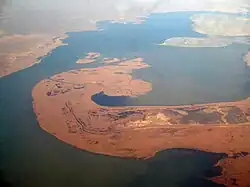 The western and northern shores of the lake are high (20–30 m) and rocky; they are composed of such Paleozoic rocks as porphyry, tuff, granite, schist and limestone and keep traces of ancient terraces. The southern shores near the Gulf Karashagan and Ili River are low (1–2 m) and sandy. They are often flooded and therefore contain numerous water pools. Occasional hills are present with the height of 5–10 m.[14] The coastline is very curvy and dissected by numerous bays and coves. The large bays of the western part are: Saryshagan, Kashkanteniz, Karakamys, Shempek (the southern pole of the lake), and Balakashkan Ahmetsu, and those in the eastern part are: Guzkol, Balyktykol, Kukuna, Karashigan. The eastern part also includes peninsulas Baygabyl, Balay, Shaukar, Kentubek and Korzhintobe.