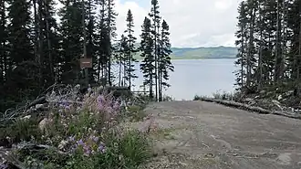 The Forêt ancienne du Lac-Cacaoui (Lake Cacaoui Old Growth Forest), an exceptional forest ecosystem occupies part of the southern shore of the lake.[11] The forest contains small islands of a few hectares of Picea glauca (white spruce) up to 33 metres (108 ft) high within stands of Picea mariana (black spruce). The spruce is dominated by Abies balsamea (balsam fir), which is well adapted to the cold and damp climate.[10] The 0.45 square kilometres (0.17 sq mi) area of old-growth forest was designated IUCN Management Category III at a national level in 2008. It is managed by the Ministère des Forêts, de la Faune et des Parcs.[12]