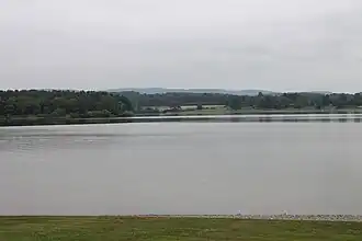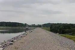 Lake Chillisquaque is dammed by an earth-fill dam known as the Lake Chillisquaque Dam.[11][12] Located on the southern side of the lake,[5] the dam is 2,000 feet (610 m) long and 54 feet (16 m) high.[11] The dam is 12 feet (3.7 m) wide at its highest point and the top of the dam forms an access road. The inner part of the dam is a silty clay material, while the outside is made of weathered shale.[11]