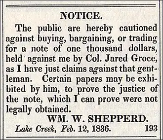 In 1837, W. W. Shepperd, in association with John Wyatt Moody, founded the town of Montgomery, Texas at the site of Shepperd's store in the middle of Lake Creek Settlement. J. W. Moody was the First Auditor of the Republic of Texas and had been Auditor of the Provisional Government of Texas.[23] They advertised sale of lots in the Telegraph and Texas Register, July 8, 1837, published in Houston, Texas.[24]