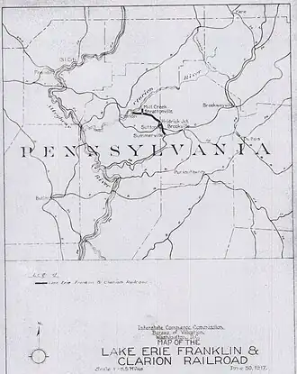 The Lake Erie, Franklin, and Clarion Railroad (reporting mark LEF) was a fifteen mile long short line that ran from a Conrail connection at Summerville, Pennsylvania, to Clarion, Pennsylvania, the county seat of Clarion County, and included a short branch from Sutton to Heidrick.[1] The road was incorporated in 1913 as a consolidation of several other railroads, the Pennsylvania Northern, Pennsylvania Southern, and the Pittsburgh, Clarion and Franklin, which itself was formed from the Pittsburgh, Summerville, and Clarion [which began operation in 1904 and was leased to the Pennsylvania Southern in 1910.[1] Length peaked at about 80 miles of track in around 1924. The corporate name was somewhat optimistic: the railroad never reached either Franklin or Lake Erie.