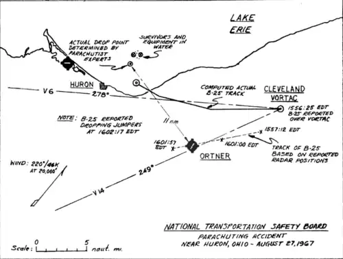On August 27, 1967, eighteen skydivers mistakenly parachuted into Lake Erie, four or five nautical miles (7.5–9.3 km) from Huron, Ohio, United States, after jumping from a civilian North American B-25 Mitchell. Sixteen drowned. The plane's pilot, unable to see the surface through heavy cloud cover, had relied on guidance from the Cleveland Air Route Traffic Control Center, which had incorrectly advised him that he was over Ortner Airport—actually twelve to thirteen miles (19–21 km) away. Jumping through cloud cover in violation of Federal Aviation Administration rules, the skydivers were unaware that they were over water until they punched through the clouds at 4,000 feet (1,200 m). Despite efforts by many to shed heavy gear, only two were able to stay above water for long enough to be rescued.