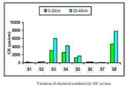 The previous studies show that the salinity is particularly important in the north, in the east and in the southeast of Fetzara Lake. The West and the center of the lake seems to be the areas slightly affected by salts due to movement of salts towards the periphery with desalination of the center Lake [7]. The Average of electrical conductivity of soil solution in the lake is about 1534 μs/cm for the layer 0–20 cm, and 2577 μs/cm for the other layer 20–40 cm, indicating a very large variation between the two layers with a high concentration of soluble salts in depth.