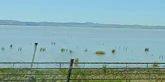 Wine grapes are grown along the western edge of the lake, on the escarpment. Sheep are grazed on the lake when it is dry or nearly so.