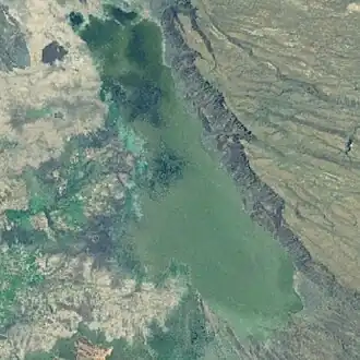 The lake lies on a roughly north–south axis, 15 kilometers long by five wide, having about 6,000 hectares of open water.[1] Gummare receives its inflow from the Awash on its northwestern shore, and its outflow is on its southern shores where a channel joins the lake with Lake Afambo.