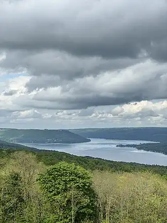 Keuka Lake (/ˈkjuːkə/ KEW-kə) is a Finger Lake in central New York state. Spanning Steuben and Yates counties, it is the third largest in the eleven-lake chain. It is unusual for its Y-shape, which contrasts with the other long and narrow Finger Lakes, earning it the historic name Crooked Lake. Keuka means 'canoe landing' or 'lake with an elbow' in the Seneca language.