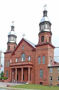 In the next block is St Joseph's Church (1901) at 701 Calumet, built of rough sandstone blocks.[2] The church is front-gabled with round arched windows, with two steeples with domed caps frame the roofline.[2] The church was built in the French Canadian tradition to serve the growing French Canadian population of the area.[2]