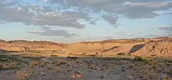 The lake existed at least until 14,230 ± 1,325 years Before Present.[48] Lake Manix drained when the Afton Canyon formed,[32] possibly around 13,800 years before present;[82] an earlier estimate of 14,000 years ago was later discarded.[83] An alternative date is about 25,000 years before present.[11] This emptying may have been quick, draining Lake Manix within a short time,[82][84] perhaps as little as ten hours.[85] The draining probably contributed to the "Lake Mojave II" highstand.[40] After the initial catastrophic cutting, a slower incision further deepened the Afton Canyon.[26] Alternative theories assume a much slower formation of the Afton Canyon outlet,[16] based on the presence of several terraces and possible recessional landforms.[85] As of 2003, the formation speed question was still not settled.[86][87] The formation of the path to Afton Canyon was probably aided by the Manix Fault, which had left easily eroded sediments.[5] The Mojave River may have drained into the Coyote Basin even after the formation of Afton Canyon[5] under the influence of faulting[88] until headward erosion cut off that basin from the river flow about 9,000–7,500 years ago.[86] Sediments transported through Afton Canyon during the event and afterwards have buried the landscape beneath Afton Canyon, potentially also contributing sand to the development of the Kelso Dunes.[31]