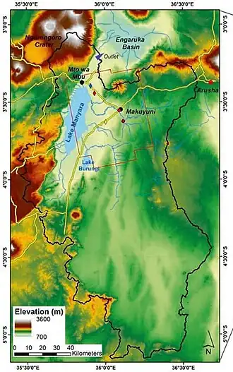 Lake Manyara has a catchment area of about 18,372 km2 with elevations between 938 m and 3633 m above sea level. The lake is in a closed basin with no outflow, wherein water is only lost by evaporation. It is fed by underground springs, but the vast majority of the inflow comes from rainwater fed permanent and ephemeral rivers that drain the surrounding catchment.[7] The lake's depth and the area it covers fluctuates significantly.[7] At its maximum, during the wet season, the lake is 40 km wide by 15 km with a maximum depth of 3.7 m.[1] In 2010, a bathymetry survey showed the lake to have an average depth 0.81 m, and a maximum depth of about 1.18 m.[7] In extreme dry periods the surface area of the lake shrinks as the waters evaporate and at times the lake has dried up completely.[7] Lake Manyara is a soda or alkaline lake with a pH near 9.5,[8] and it is also high in dissolved salts. The water becomes increasingly brackish in the dry season as water evaporates and salts accumulate.[9] During dry spells, large areas of mud flats become exposed along the shore.[8] These alkaline flats sprout into grasslands, attracting grazing animals, including large herds of buffalo, wildebeest and zebra.[3] The Western side of the lake is flanked by a steep rift escarpment, to the North are the Ngorongoro highlands, while in the East and Southeast an undulating plain with isolated volcanic mountains gives way to a peneplain. Several springs, streams, wetlands and smaller lakes, both perennial and seasonal, drain into the lake. The shores of the saline lake host at its Northern tip the town of Mto wa Mbu with its irrigation agriculture. On its Western side there is a groundwater forest extending between the lake shore and the rift escarpment and covered mostly by the National Park until the Marang' forest. In the rift valley South of the lake vast river floodplains are used for irrigation agriculture. The wetter and more productive uplands all over the catchment are mostly used for rain-fed agriculture by various ethnicities depending on historical migration and resettlement patterns. The drier and more unpredictable savannas are used for livestock grazing by pastoralists (mainly Maasai). Southeast of LM another large and famous national park (Tarangire) is located. Furthermore, all over the catchment there are numerous game reserves, conservation areas, forest reserves, wildlife management areas and numerous villages and touristic infrastructures (roads, lodges and tented camps).