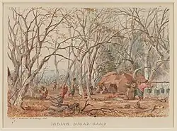 A watercolor painting by Seth Eastman of a sugar camp, most likely Dakota near Fort Snelling
