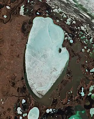 With an area of 323 km2 (125 sq mi), it is the largest coastal lagoon in the Yana-Indigirka Lowland[1] the lake freezes in the second half of September and melts in June.[2] The Bogdashkina river mouth lies to the west of the lake and Gusinaya Bay to the southeast.[3][4]