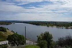 Lake Natoma is a small lake in the Western United States, along the lower American River, between Folsom Dam and Nimbus Dam in Sacramento County, California. The lake is located within the Folsom Lake State Recreation Area which maintains the facilities and bike trails surrounding the lake. Lake Natoma is located 15 miles (24 km) east of Sacramento, and has 500 surface acres of water. The total length of Lake Natoma is 4 miles (6.4 km).