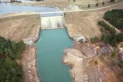 The concrete-and-earthfill dam is 10,600 feet (3,231 m) long. The crest of the spillway is 249.5 feet (76.0 m) above mean sea level. The conservation storage capacity is 250,000 acre-feet (310,000,000 m3) with a surface area of 18,680 acres (76 km2). The bayou has a length of 140 miles (225 km) and a total drainage area of 850 square miles (2,201 km2). The lake's normal conservation pool is 230 feet (70 m) above mean sea level. The lake provides water supply storage for the Northeast Texas Municipal Water District which serves the cities of Jefferson, Ore City, Lone Star, Avinger, Hughes Springs, Daingerfield, and most recently Longview. The water supply storage exists in the conservation pool between elevations 201 to 230 feet (70 m). Water intake structures are located at various points on the lake and one downstream of the lake. Discharges from the two gates in the control structure located on the southeast end vary from a minimum of 5 cu ft/s (0.14 m3/s) to a maximum of 3,000 cu ft/s (85 m3/s).