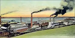 Among its provisions was the transfer of the lands around the lake from the Onondaga Nation to local salt producers on the condition that the salt would be produced for the common use of everyone.[20] By 1822, due to a high incidence of malaria, the lake's water level was lowered after its outlet to the Seneca River was dredged. The low-lying swampy area, located in what is now the northern end of downtown Syracuse, was drained.[19] The completion of the Erie Canal through New York State in the mid-1820s and the commercial production of salt brought an increase in settlement of the area. The lake's western shore became increasingly industrialized as the nineteenth century progressed.[6][22]