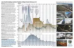 In February 2017, extreme precipitation and high spillway releases caused significant damage to the main concrete spillway. Due to this damage, releases were cut back and lake level increased to 101% of capacity, causing the emergency spillway to overflow for the first time in the Lake's history.[12] Below the emergency spillway, severe erosion occurred, and fear of a failure of the emergency spillway prompted an evacuation of downstream residents.[13]