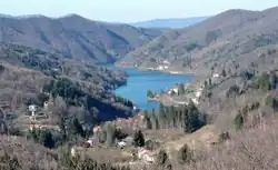 With 3 km of length and a capacity of 13 million cubic meters of water,[1] that of Osiglia is the largest lake in the Province of Savona.[2] A road runs along its right side, and about halfway along its length, it is crossed by the Manfrin bridge, named after its designer, which allows connection to a small inhabited hamlet.[3] It is a protected area of provincial interest[1] and is safeguarded by the SIC designated Lake Osiglia protected area (code IT1323115).[4]