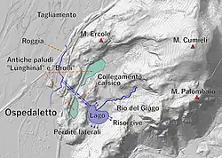 The karstic nature of the rocky layers of the basin allows, on one hand, a source of supply through some springs (on the southeastern and probably northern sides), and on the other, a likely underground outflow of water through fissures on the southern side. Additionally, there is an exceptional natural connection of erosive origin with the artificial channel of the Roggia dei Molini,[2] (it is likely that the course of the water, dating back to the 13th century, was dictated by the need to capture this source near the settlement of Ospedaletto).[5]