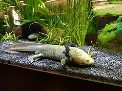 Induction of metamorphosis via thyroxine shortens the lifespan of the salamander to 5 months from the start of metamorphosis, while non-induced lifespans only last 48 days on average.[17][4] These specimen will refuse to eat and require assisted feeding to survive.[9] Hybrids between A. dumerilii and its relatives, often A. mexicanum (the axolotl) and A. tigrinum (the tiger salamander), are also prone to spontaneous metamorphosis but show a stronger tolerance to survival.[4] This is because Ambystoma dumerilii lacks the genes necessary to carry out metamorphosis to completion, often leading to detrimental phenotypes, bodily asymmetry, and ultimately death.[16][17]