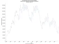 Colorado River flows have been below average since 2000 as a result of the southwestern North American megadrought, leading to lower lake levels. In winter 2005 (before the spring run-off) the lake reached its then-lowest level since filling, an elevation of 3,555.10 feet (1,083.59 m)[12] above sea level, which was approximately 150 feet (46 m) below full pool. After 2005, the lake level slowly rebounded, although it has not filled completely since then. Summer 2011 saw the third largest June and the second largest July runoff since the closure of Glen Canyon Dam, and the water level peaked at nearly 3,661 feet (1,116 m), 77 percent of capacity, on July 30.[12] However, water years 2012 and 2013 were, respectively, the third and fourth-lowest runoff years recorded on the Colorado River. By April 9, 2014, the lake level had fallen to 3,574.31 feet (1,089.45 m), largely erasing the gains made in 2011.[12][13]
