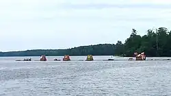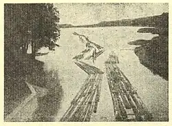 The opening of the canal led to the development of timber rafting. The primary cargo transported across the lake this way was pines from the forests around Ostróda and Iława. The wood was floated using rafts, which were tree logs layered and bound together. Each raft contained 12 to 15 logs, and its dimensions were strictly regulated by the Canal Police Regulations of April 11, 1861. It was prohibited to float timber at night or to transport unbound logs.[18] The rafts were propelled with long pike pols and towed with ropes along towpaths. The driving force was provided by both humans and horses.[19] The towpath ran along the eastern shore of Lake Ruda Woda.[16]