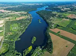 Two distinct, noticeably shallower bays can be found to the east and west of the main body of water. The western bay near the village of Sople contains three small islands. On the opposite shore of the western bay, where the former site once served to store and prepare wood for rafting, a scout camp has been established. The camp hosts annual sailing and scouting events. The eastern bay, known as Zatoka Drela (Drela Bay) or Żydowski Kąt (Jewish Corner), is where the lake's main tributary, the Drela River (German: Drehle), flows in. The name Żydowski Kąt (Jewish Corner) originates from wartime stories among the local population, which claim that the Jewish owner of a nearby inn and his family were drowned in the lake.[9] Stretching to the southeast, Drela Bay, together with the lake's main route, forms a peninsula known as Stańkowo.[10] In the southern part of the lake, two small bays extend northwest, where the village of Liksajny is located. The lake features seven uninhabited islands, the largest of which is situated in the northern part, opposite the village of Wilamowo.