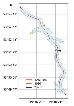 The long and narrow lake runs in a north-south direction, and its course is characterized by numerous bends. The total length of the lake, measured along the centerline, is 12.01 kilometres (7.46 mi), with an average width of only 497 metres (1,631 ft). At its widest point, the lake measures 1,650 metres (5,410 ft). While historical sources often list the lake's area as 654.1 ha (2.525 sq mi)[7] —a figure that continues to be incorrectly cited— modern government topographic maps show it as 613.4 ha (2.368 sq mi).[8] The coastline is 35.8 kilometres (22.2 mi) long.