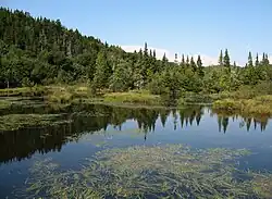 The dam Cyrille-Delage raises the level of Lake Saint-Charles because it constitutes the reservoir for the water supply of the drinking water treatment plant in the city of Quebec.[3] Erected at the exit of the lake in 1934, it was replaced in 1948 and the lake raised again. As a result of this dam, the surrounding lowlands were submerged over widths up to 50 metres (160 ft). Today, the lake level is higher than it was originally about 2 metres (6 ft 7 in). This impoundment therefore upset the physical and biological balance by modifying the morphometry of the lake, bringing a massive supply of sediment and periodically creating a significant deficit in oxygen over half of the water column. A new problem appeared at Lake Saint-Charles in the fall of 2006 when the presence of blue algae, or cyanobacteria, was detected. The causes of this phenomenon are currently being studied, but actions have already been taken to limit phosphorus supplies.